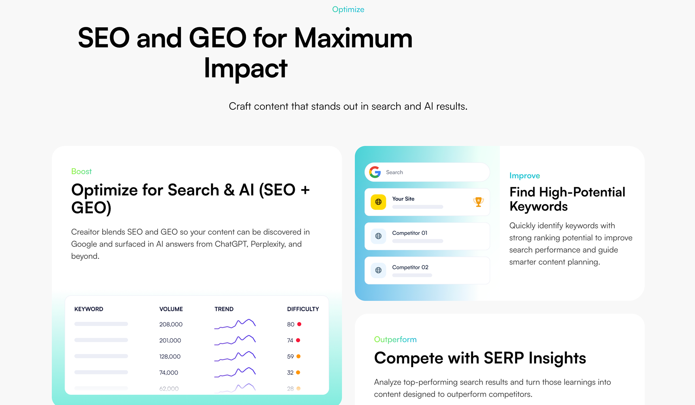 >\ SEO + GEO Optimization: Helps creators write for both audience and algorithms.