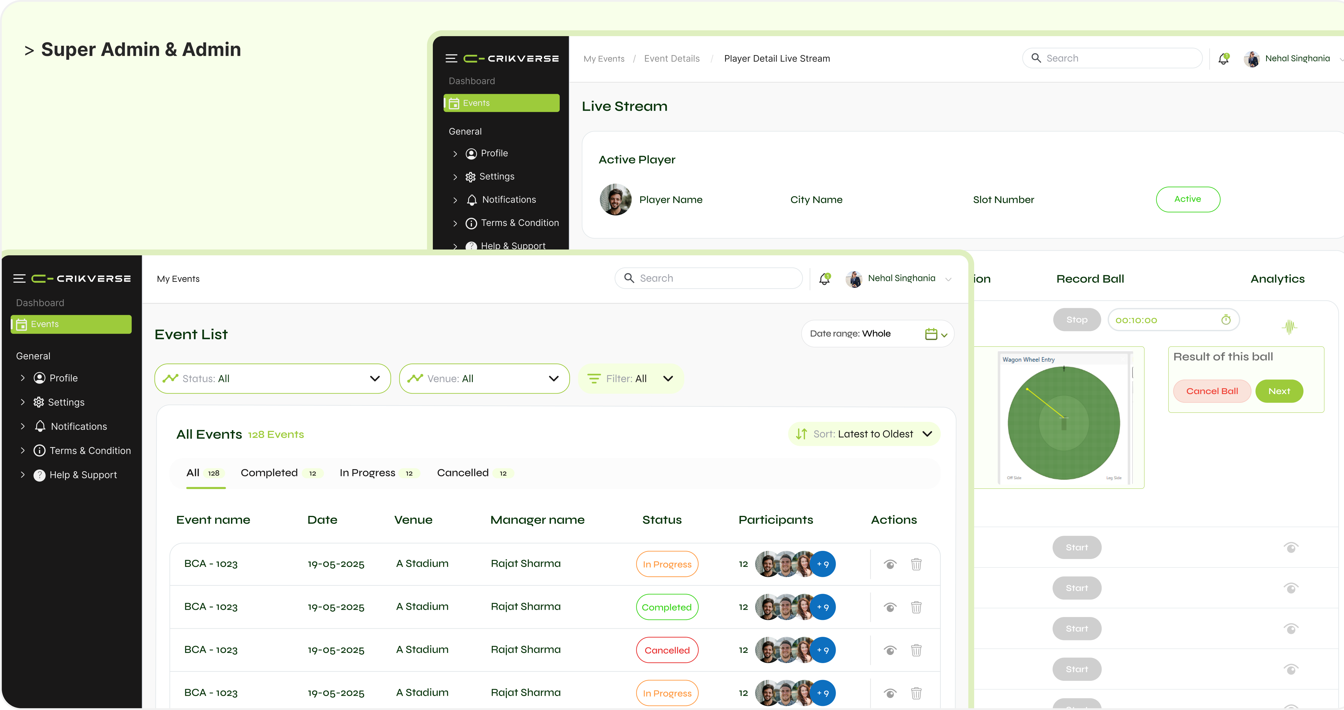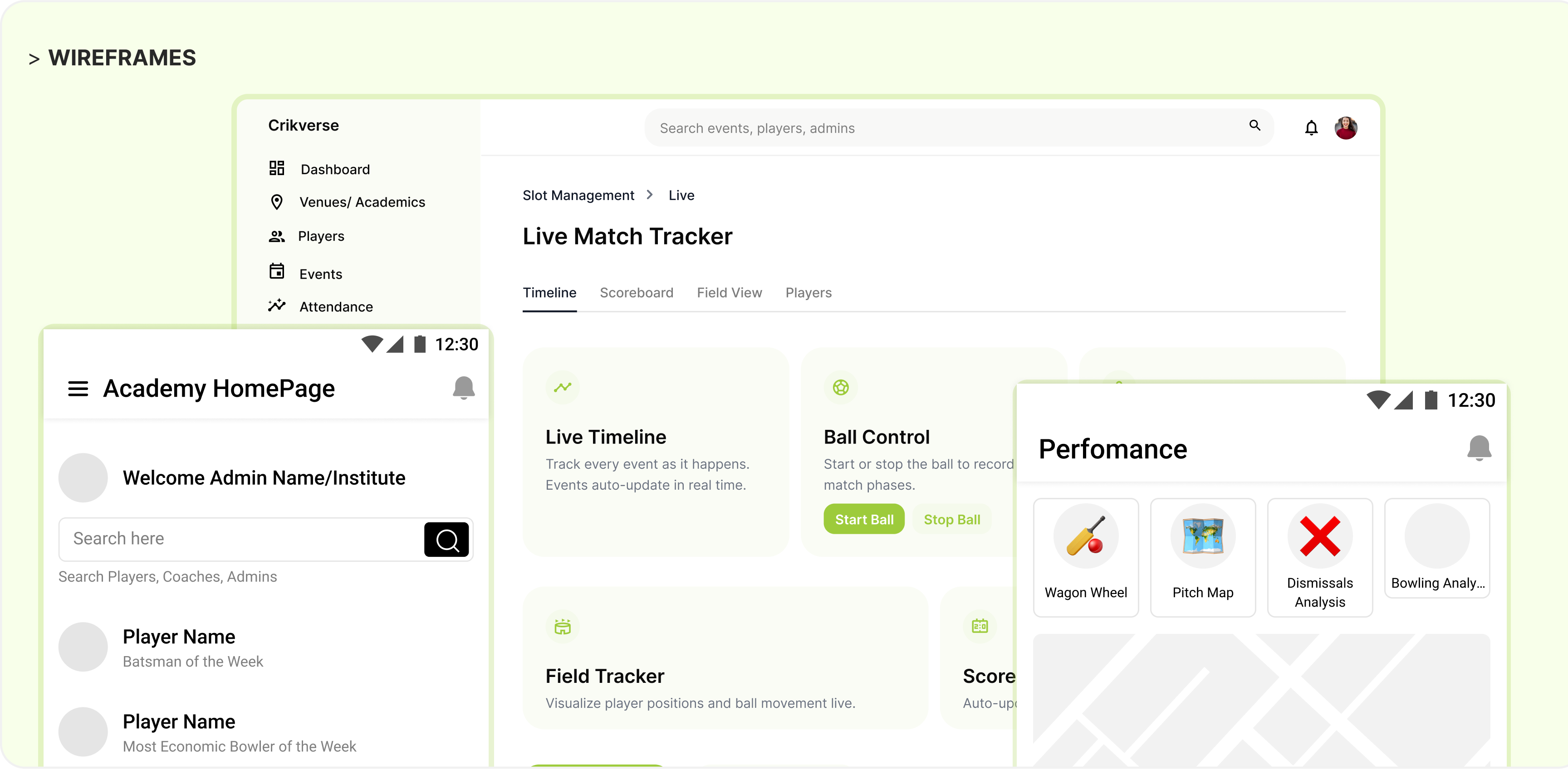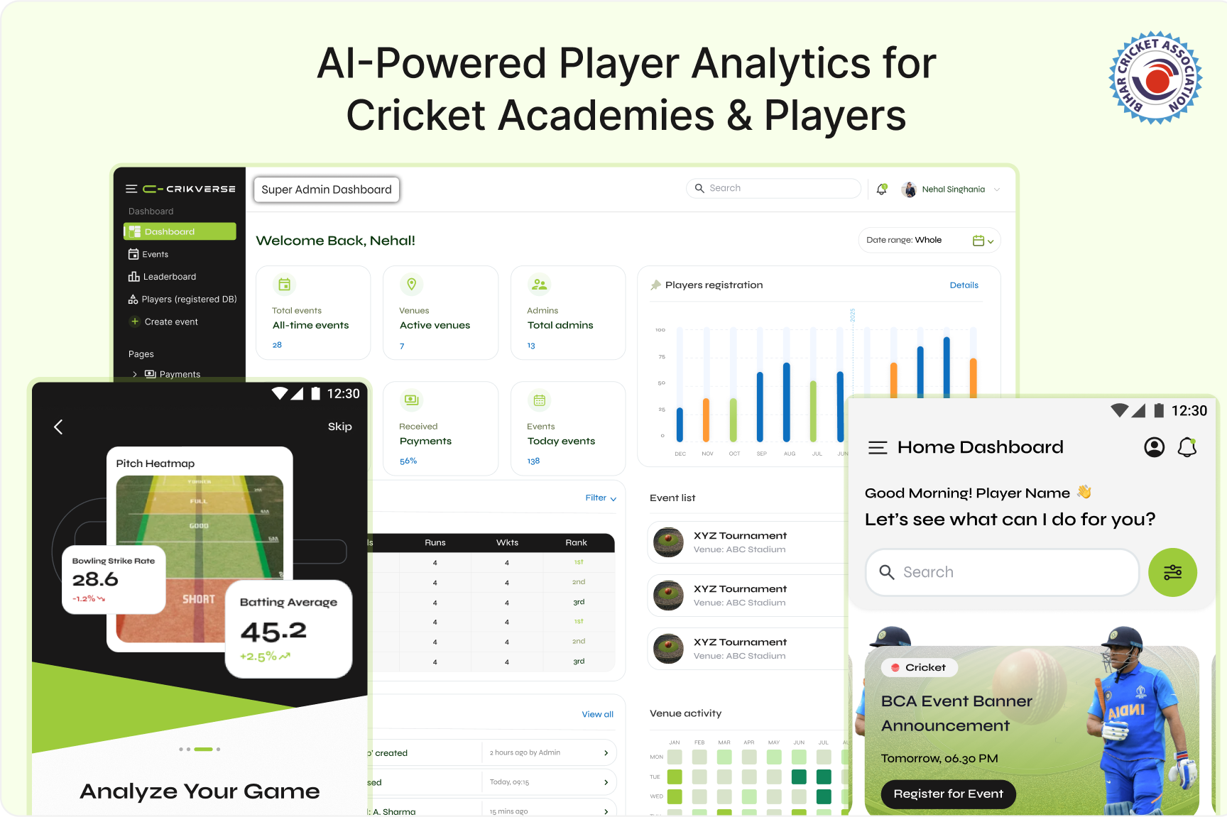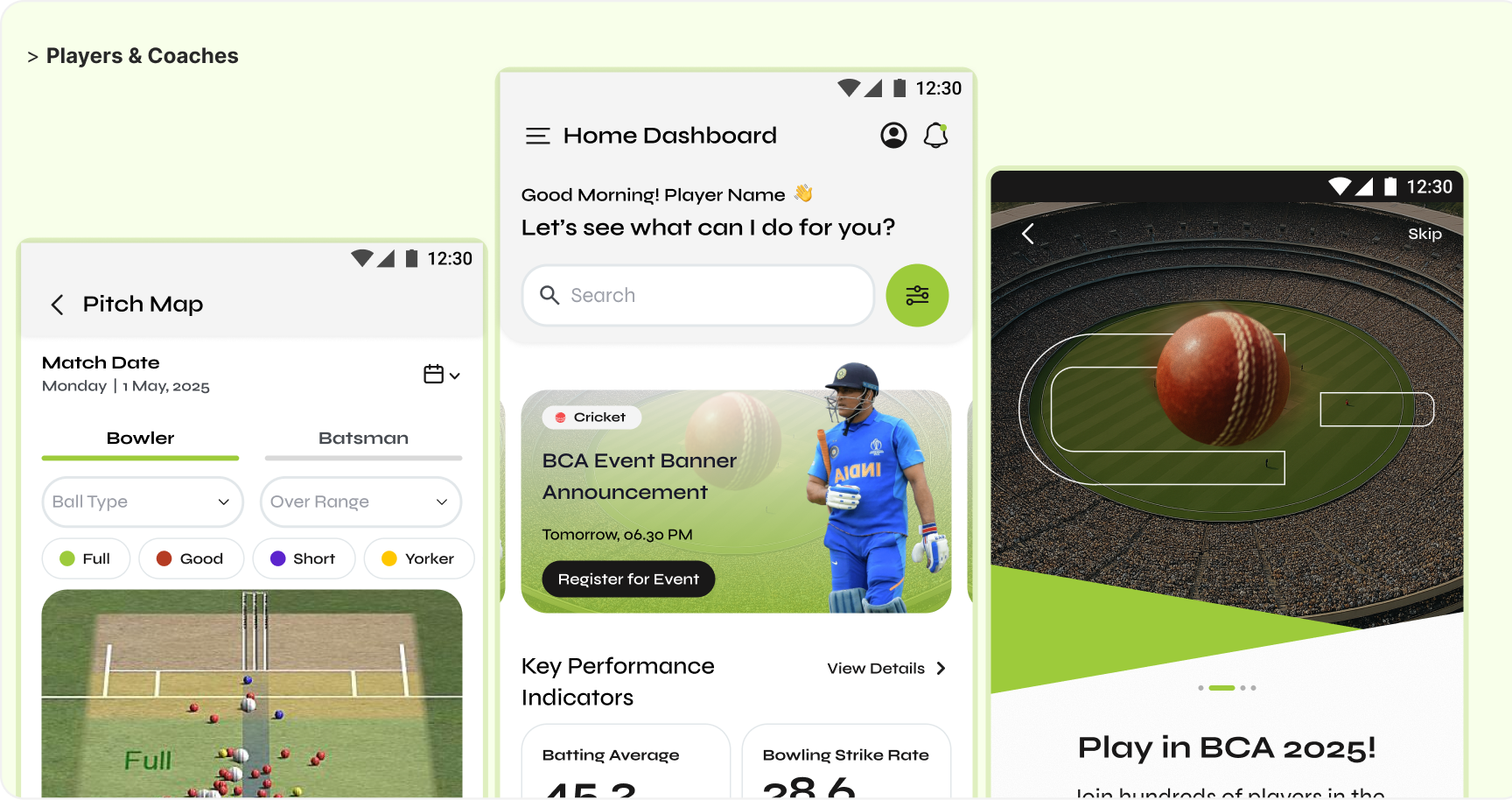 Cricket academies across India were using manual spreadsheets to register players, manage sessions, and track match data. Coaches struggled to analyze individual player performance, while admins lacked real-time visibility into academy operations.
